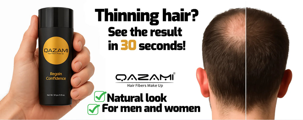 QAZAMI hair fibers conceal thinning areas in seconds. Suitable for men and women, available in 7 colors for a natural result. Resistant to wind, rain, and sweat.